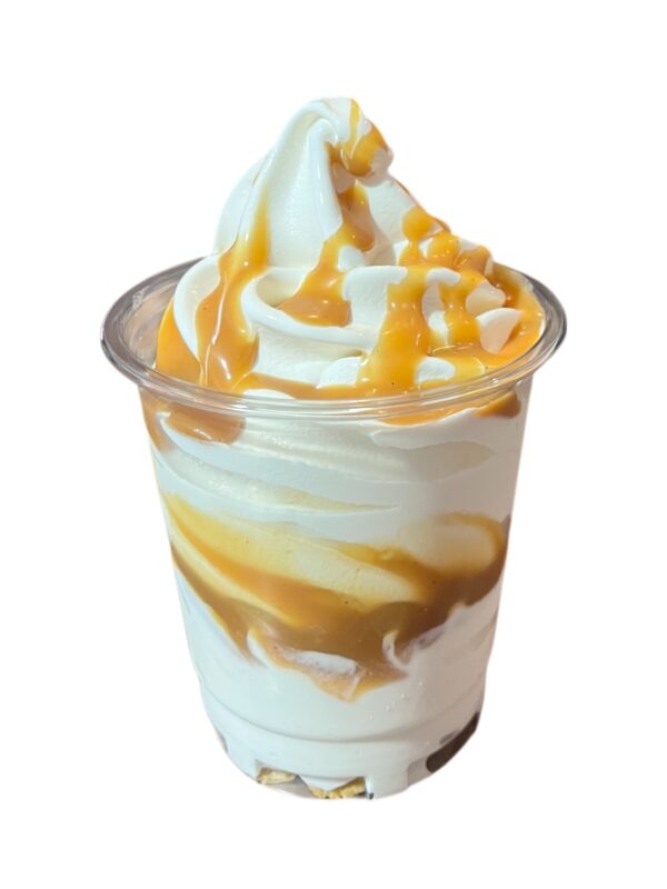 通常サイズの濃厚ミルクソフトクリームに+150円で塩キャラメルソースを追加できます!